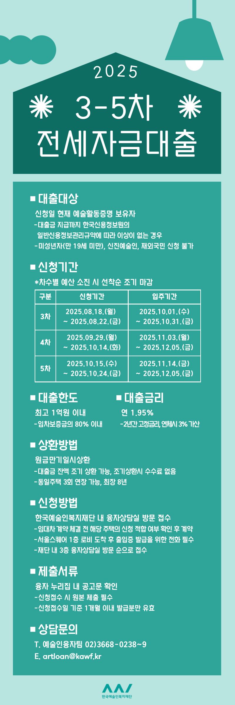 2025년 하반기 예술인 전세자금대출(융자)사업 신청 접수 일정을 안내 드리오니, 해당 사업에 관심 있는 협회원 여러분들의 많은 신청 부탁드립니다.