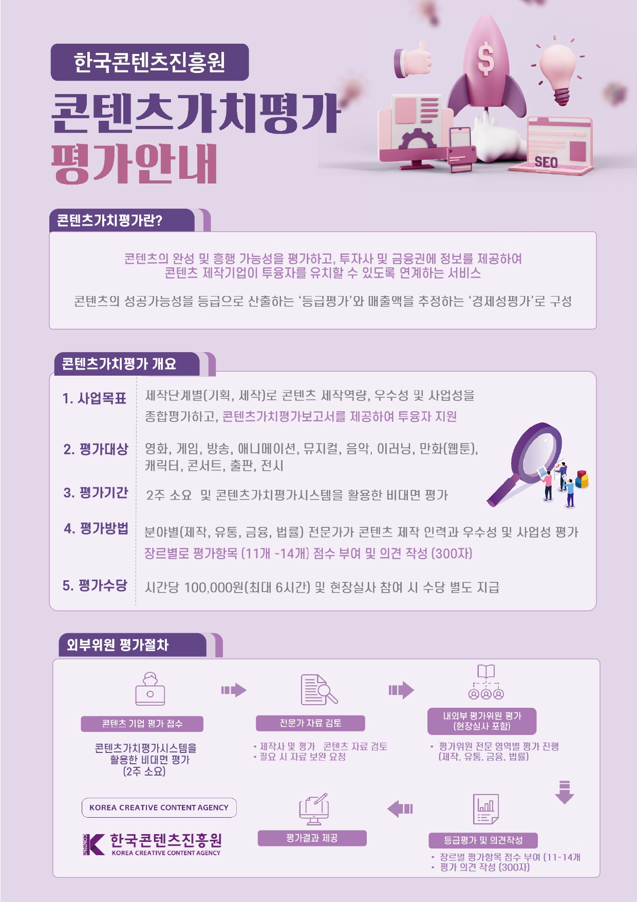 한국콘텐츠진흥원에서는 국내 콘텐츠 산업의 지속적인 성장과 투자의 활성화를 위해 콘텐츠가치평가를 수행하고 있습니다. 콘텐츠 산업 및 금융·투자 분야에서 전문성을 갖춘 심사위원을 모시고자 하오니 관심 있으신 협회원 여러분의 많은 참여 부탁드립니다.