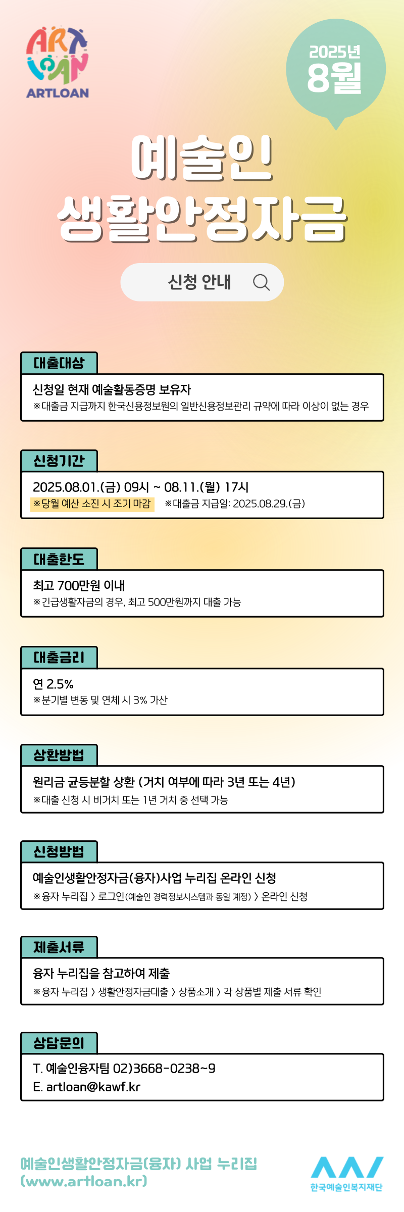 2025년 8월 예술인생활안정자금(융자)사업 신청 접수 일정을 안내 드리오니, 해당 사업에 관심 있는 협회원 여러분들의 많은 참여 부탁드립니다.